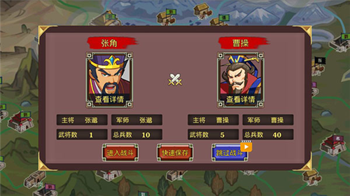 3、交战画面用卡通的形象表现出来,能直接点击屏幕上的指令和武将技。