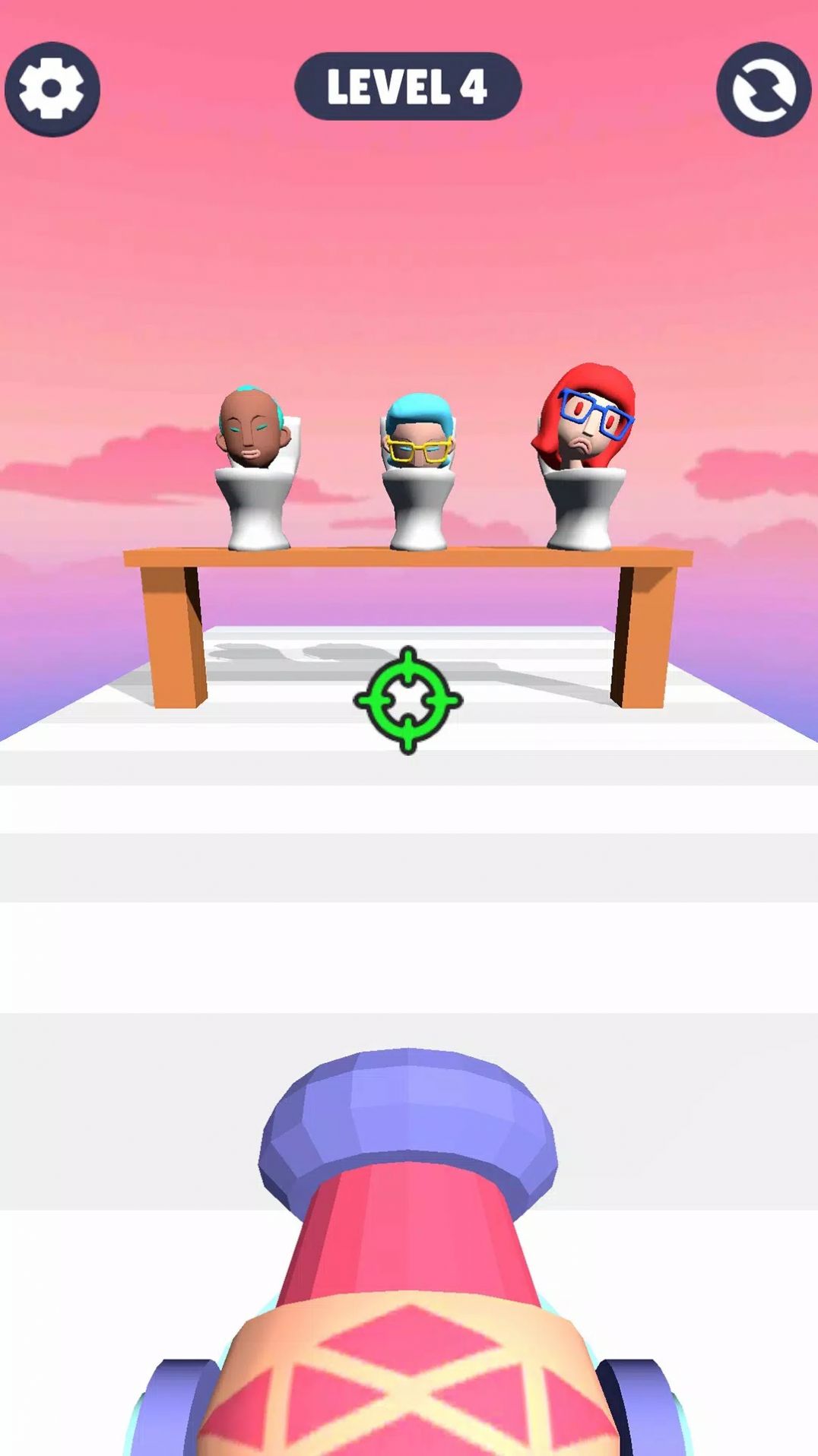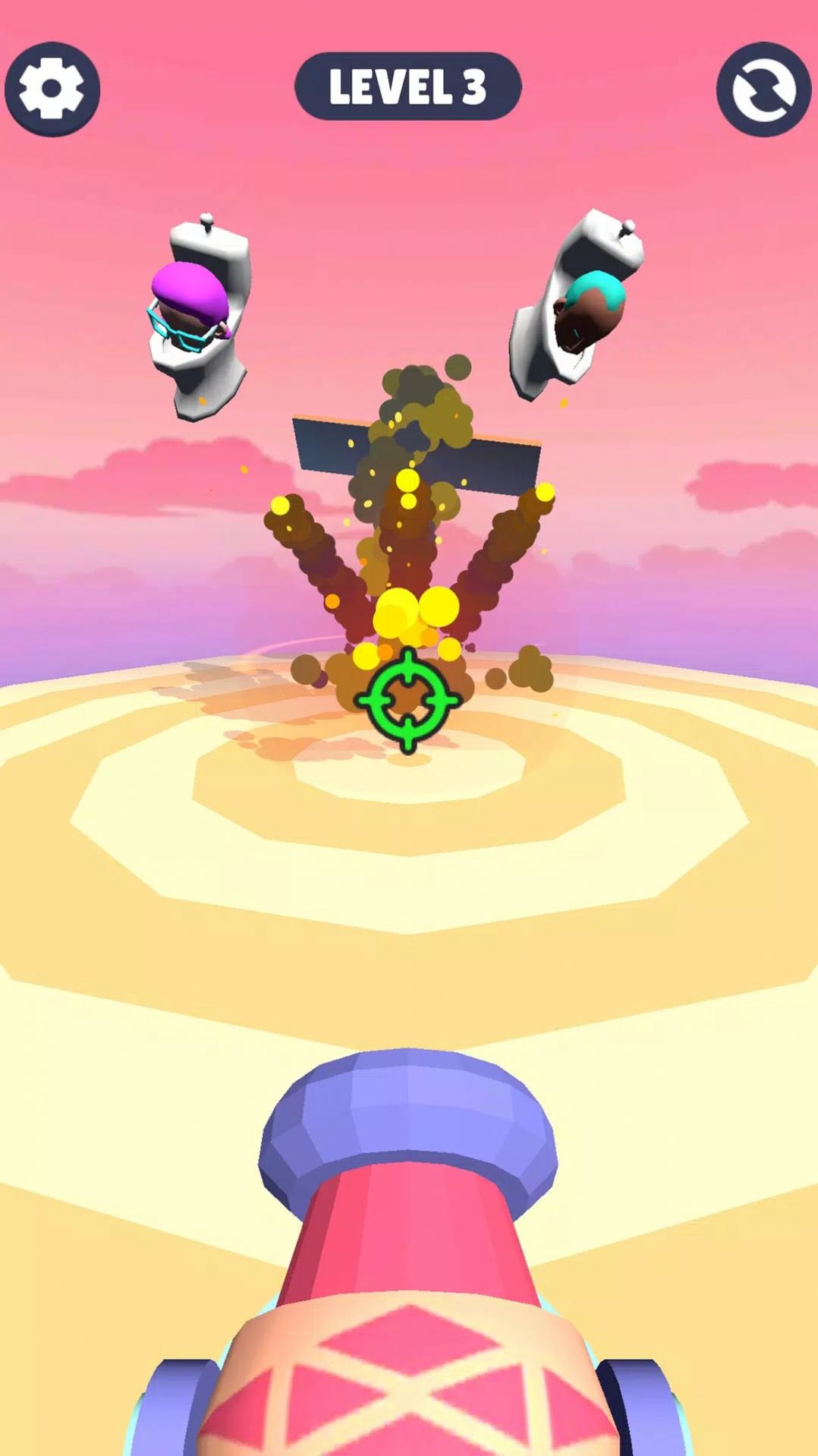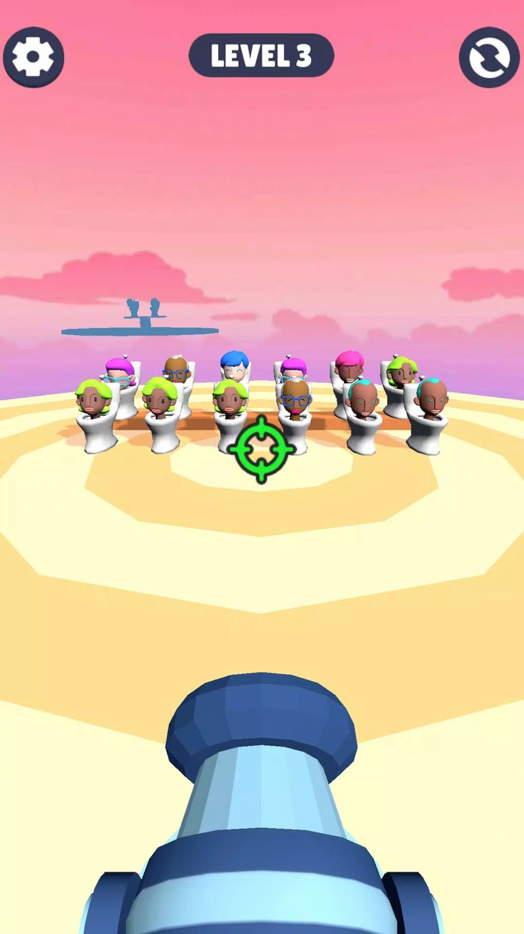 1、通过精准瞄准与发射马桶炮弹击败敌人,收集资源以提升角色和大炮性能;