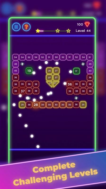 1、发射小球,消除屏幕中的所有方块,赢得更多的得分;