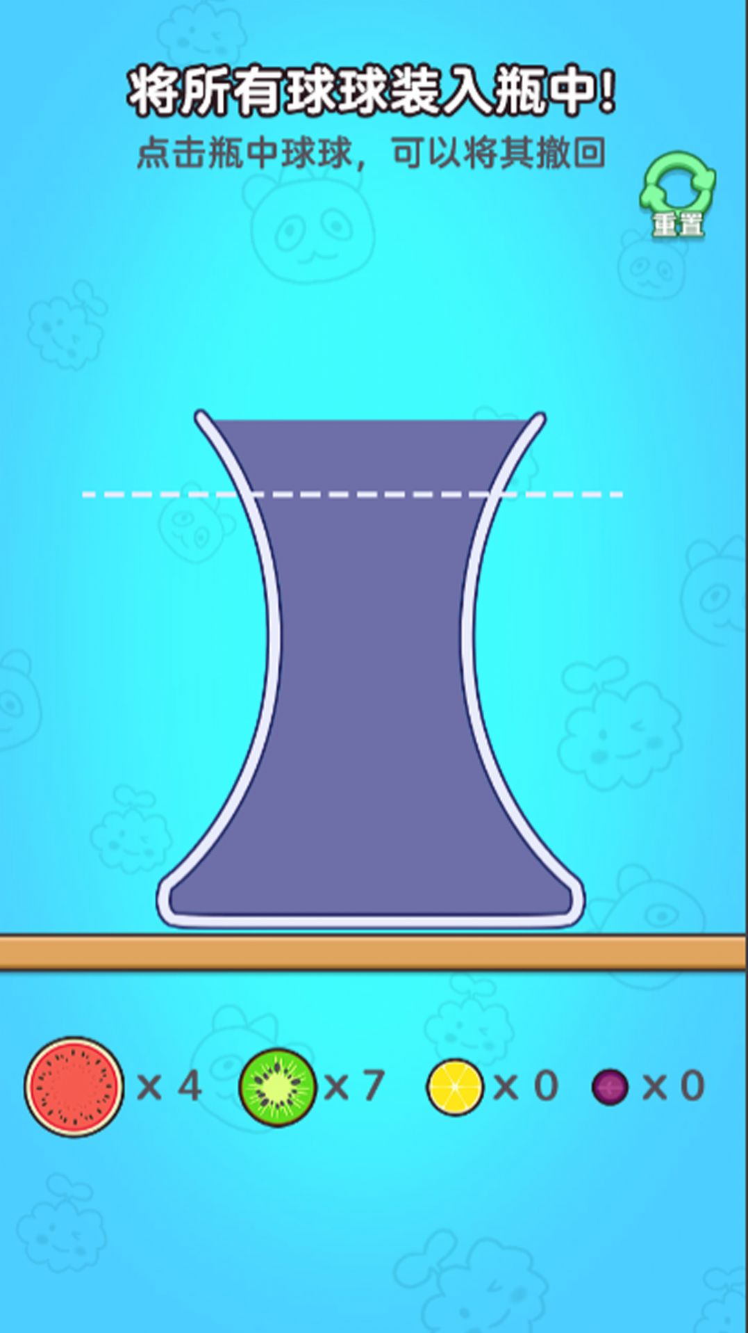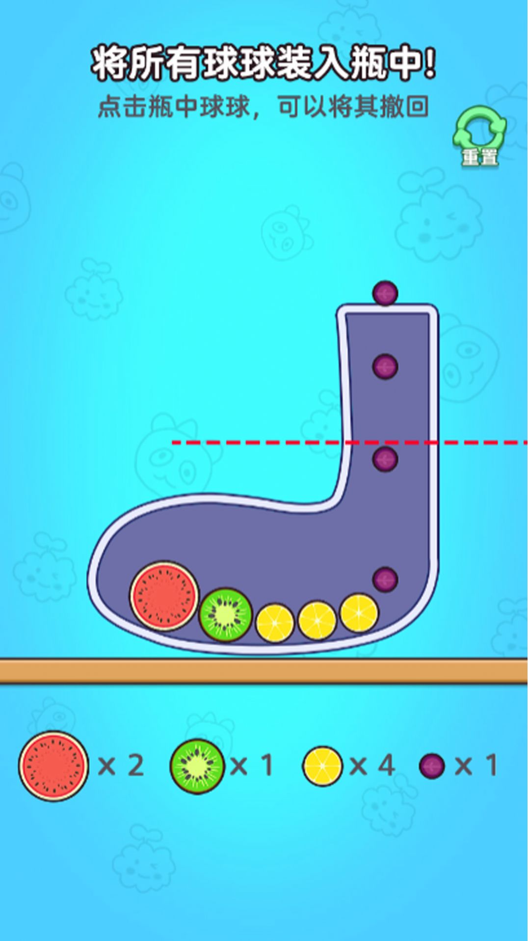 2、随时都可以来玩耍,当你将目标个数的不同水果装满瓶子就算过关;