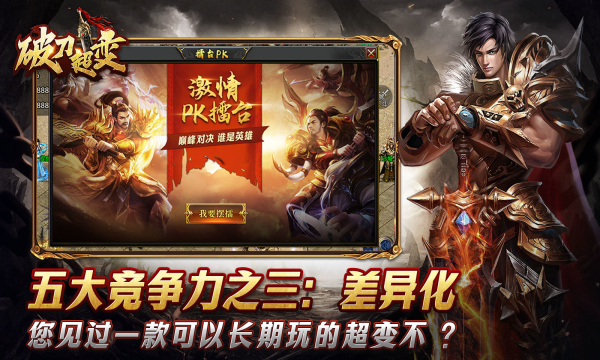 破刀超变是一款很好玩的热血传奇游戏,玩家需要在游戏内完成各种对战任务,这里的职业角色很多,像战士,法师道士等等都是可以选择的,它们都是有着不同的属性的,这里的装备都是有着不同的作用的,玩家可以将它们进行组合,帮助角色获得更多的战斗力,这里有着独特的破刀超变系统。
