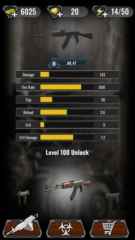 1、可通过升级的方式提升武器的射击间隔、弹夹大小、填装速度等,而且人物升级还有机会解锁新枪。