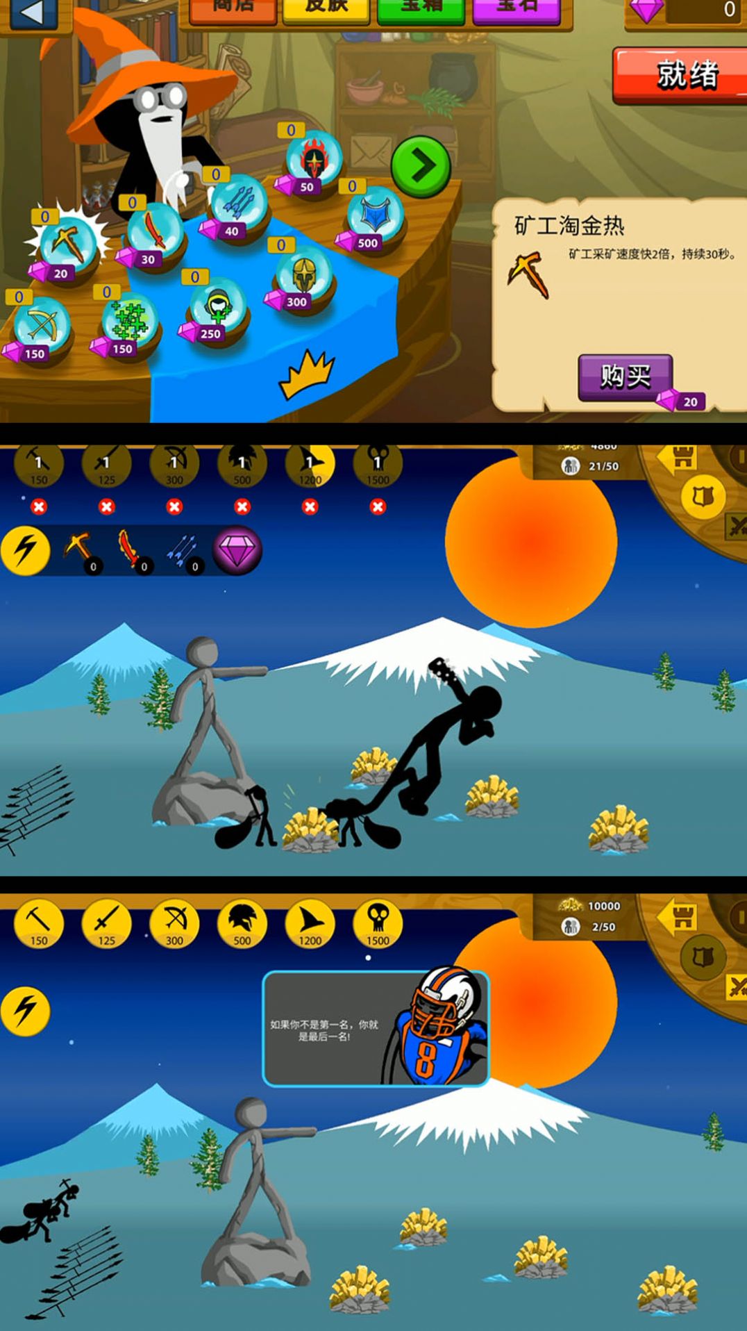 2、技能升级系统,通过闯关获取经验,提升火柴人的各项能力,解锁更强战斗力;
