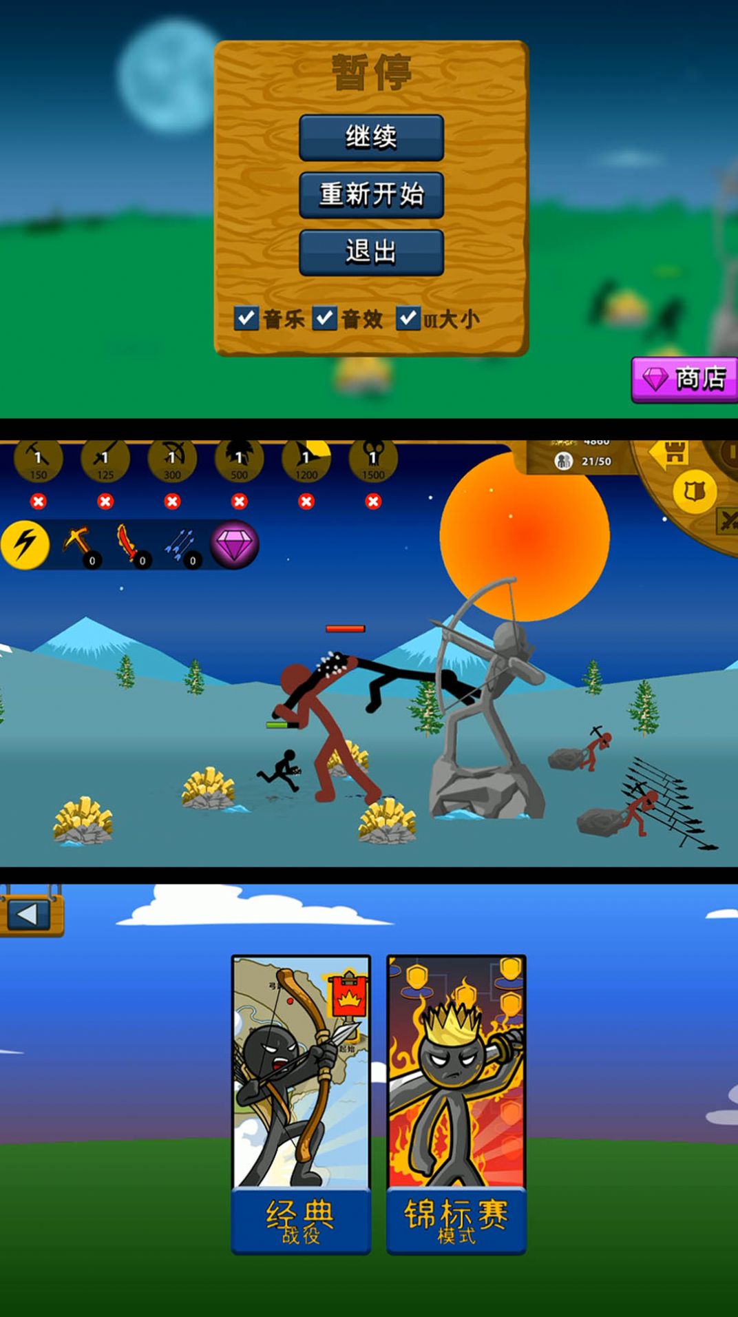 3、丰富武器装备,打造各式武器,结合不同兵种特性,打造最强火柴人军队。
