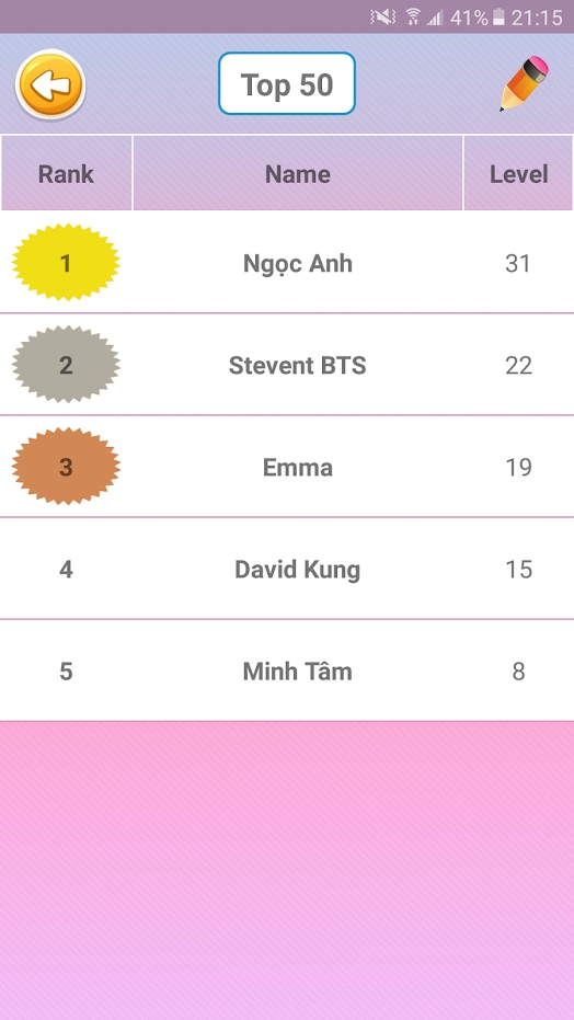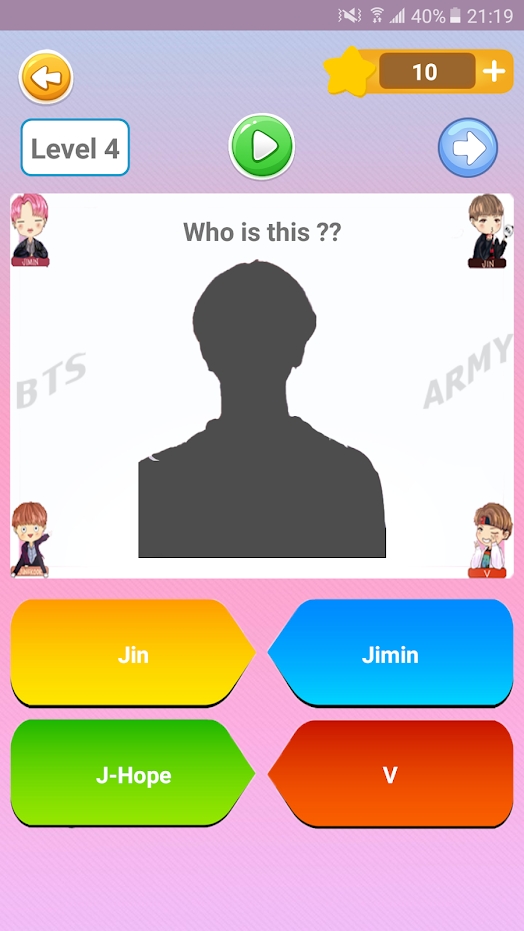 防弹少年团猜猜这是谁是一款让玩家在游戏中体验看身影猜人名的游戏,这款游戏的主要玩法就是猜测,玩家要根据关卡中显示出来的人体特征来猜测人的名字,回答正确的玩家可以领取关卡的奖励,回答错误的玩家则只能失败,但是玩家可以反复挑战同一个关卡。