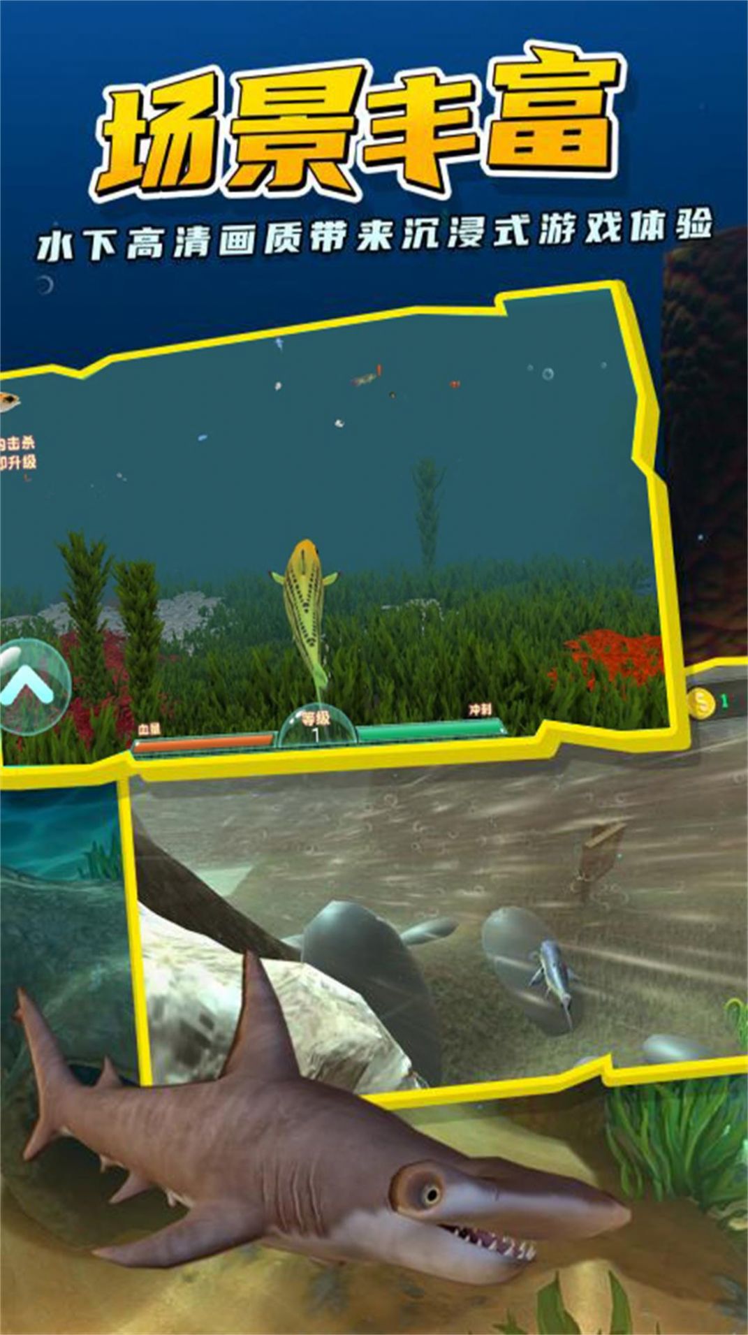 1.最终的挑战是在3d世界中游,在充满惊喜和危险的多样化水下世界中寻找食物,捕食各种鱼类。