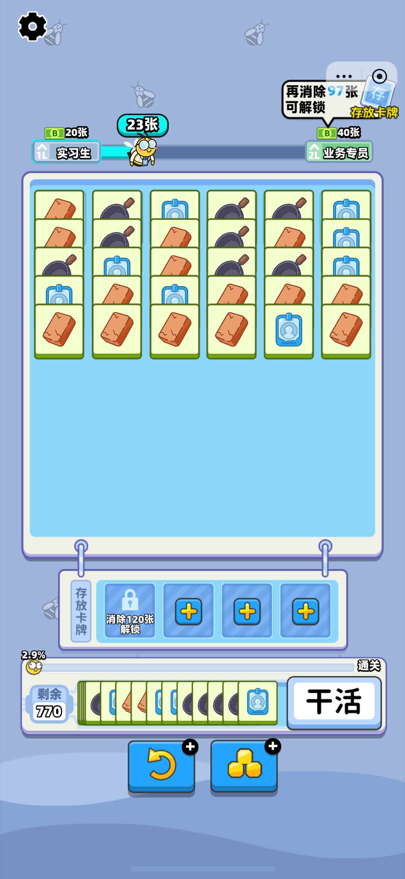 上班不能停是一款很有意思的消除游戏,玩法很简单,玩家需要将各种不同的卡牌按照顺序进行点击,只要连续点击三张相同的卡牌就可以将这三张卡牌消除,然后进行下一种图案的消除,整体和羊了个羊相似,但不一样的是,游戏以职场为背景,你还可以在线面试,感兴趣的小伙伴不妨下载试试吧!