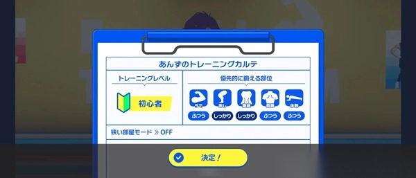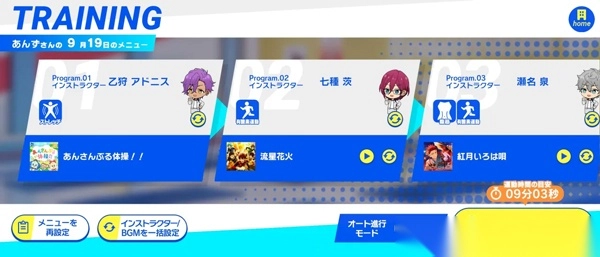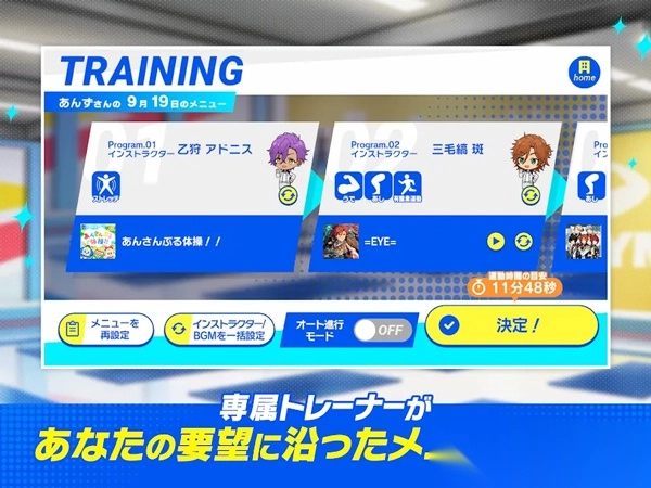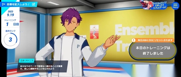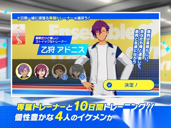 首次进入游戏后,玩家需先根据提问回答自身的体能状况、想锻炼的强度、以及锻炼部位等问题,接着从乙狩阿多尼斯、七种茨2 位角色之中选择未来10 天的指导教练(天满光、濑名泉需达到10 级后才会解锁)。