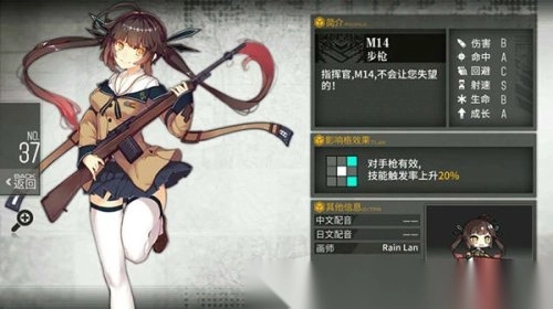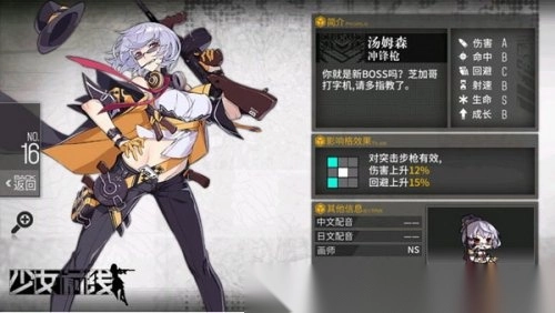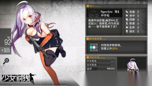 这是一个适合新手玩家使用的前排,主要是没有C项,属于能力均衡的低星枪娘,主要突出属性也正好是前排适合的回避能力。SpectreM4技能为掩护专注,持续时间内提升自身闪避,适合作为打前期BOSS的前排。