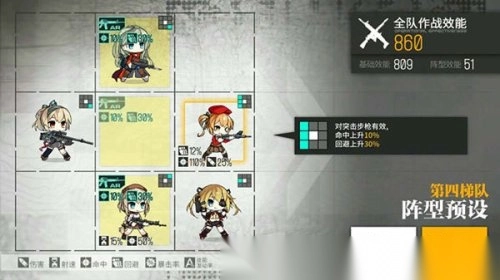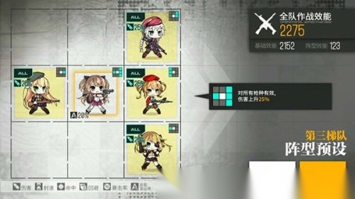 -由于阵型加成系统的设定,玩家除了选择合适自己目前阶段的战术少女外,在组建梯队的时候还要注意到枪种搭配的问题。一般来说,一个正常的梯队有5个位置,需要两名冲锋枪作为肉盾,其他三个位置作为输出(可选择突击步枪、步枪、机枪),看情况选择是否加入手枪作为辅助。