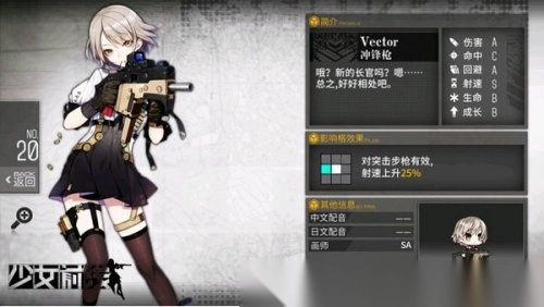 作为前排肉盾,Vector生命评价略低,但回避高的优点弥补了这一不足,较大地提高了她的生存能力。另外,Vector射速极快伤害又高,可以快速消灭敌人的有生力量,打密集型的敌方近战(如机械兵)较为不俗。