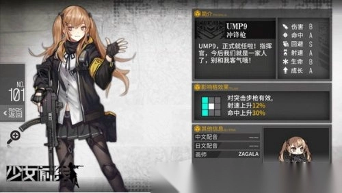 回避S绝对是让UMP9成为不俗肉盾最主要的因素,再加上成长A的评价,越是到后期,闪避能力越是强大。另外,UMP9的技能属于范围控制型技能“闪光弹”,能为梯队争取作战时间,也进一步降低了自己被重创的风险。UMP9适合搭配暴力队友,对阵敌方的步枪梯队。