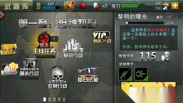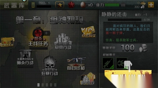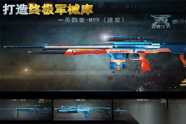 这里的武器极具多样性,除了基本的狙击枪外,还有冲锋枪、重机枪等武器。而且每种武器还留有一定的强化空间,玩家可根据不同的任务选择同等类型的作战武器进行对敌歼灭。