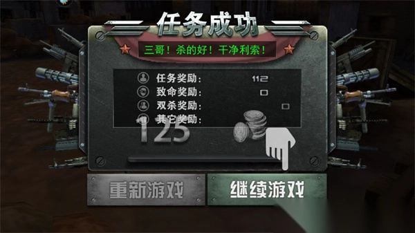 8、击杀敌人便可获得任务成功,然后还可以获得任务奖励,接着点击继续游戏;