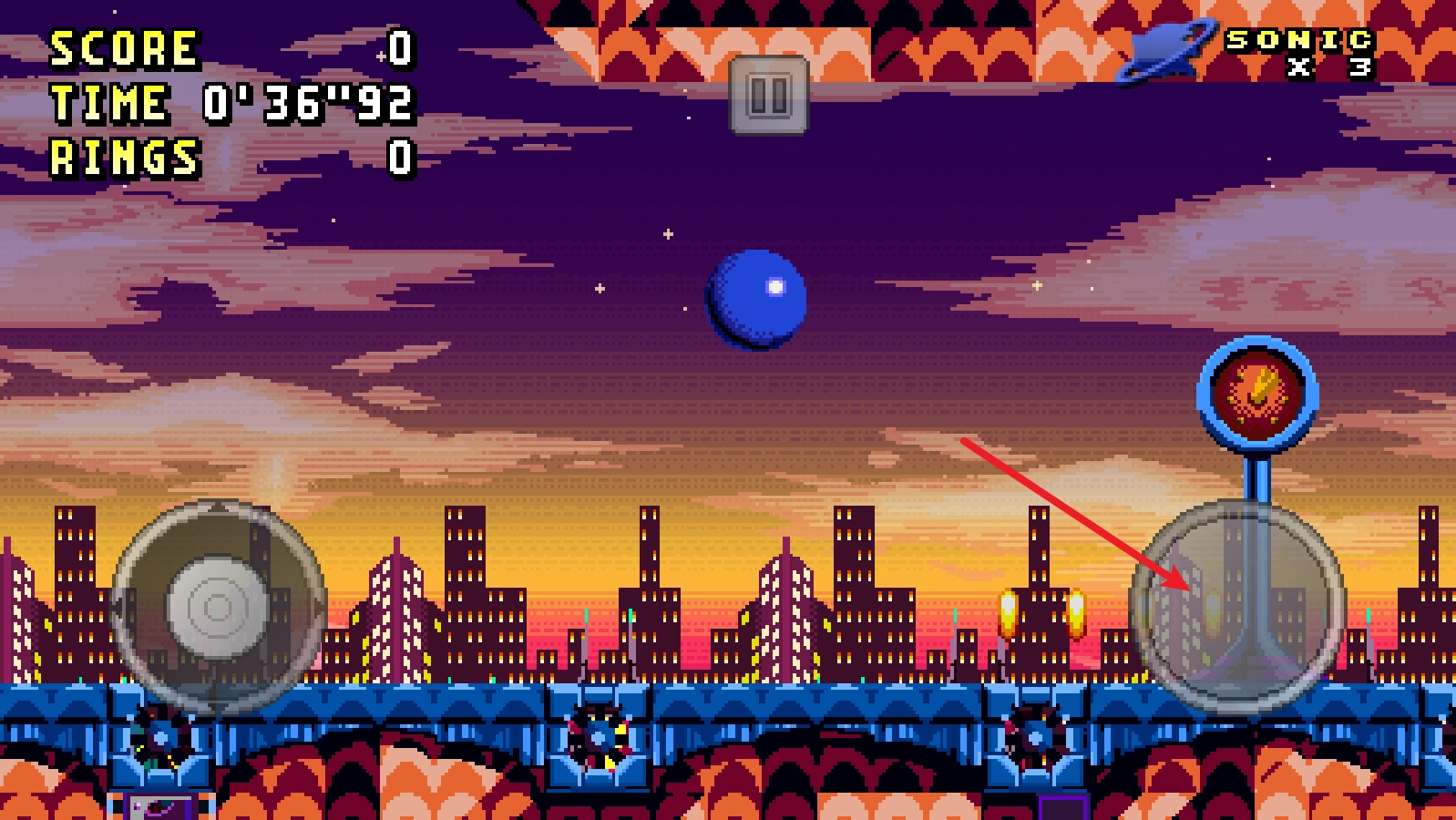 2、右侧的按钮可以控制索尼克进行跳跃,并且长按会跳的高一些。