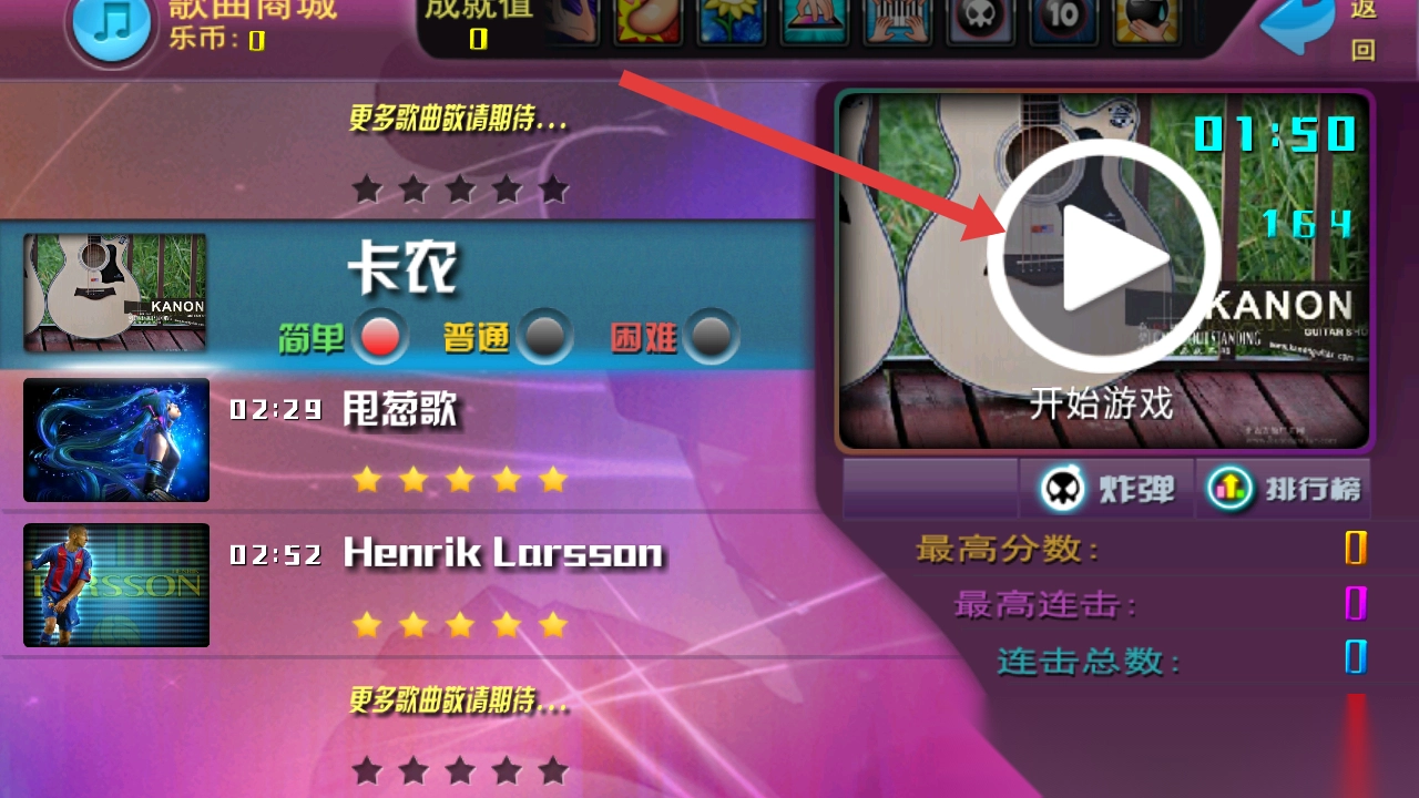 1. 进入乐动舞指游戏后,在歌曲列表的选卡农中选择曲目,挑选【简单】难度,点击右侧的播放图标开启游戏。