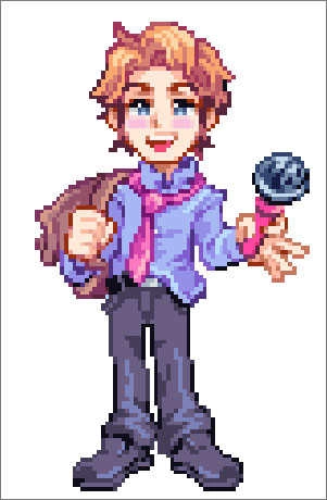 他右手将一个棕色的背包背在右肩上,左手用拇指和食指松松地拿着一个粉红色的麦克风。每当他不唱歌时,他的头就会闪闪发光