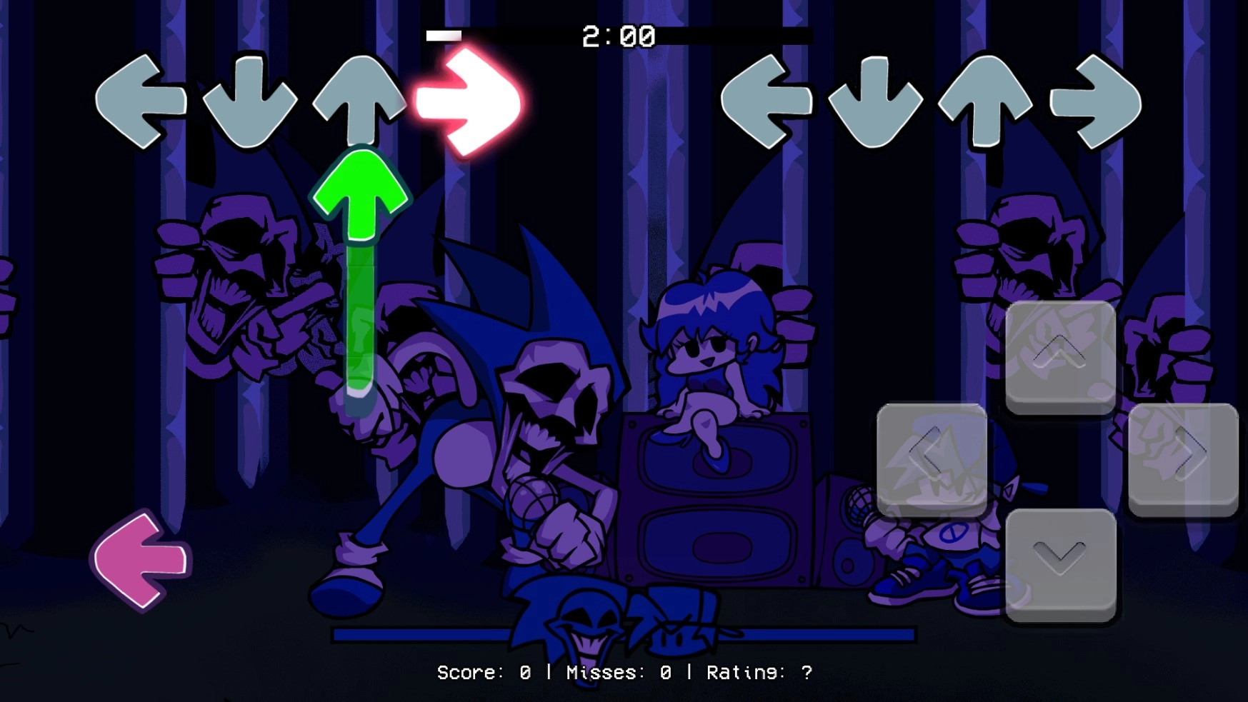 进入音乐对局,方向键头会逐渐从屏幕下方升到屏幕上方,在下方的箭头与上方固定的箭头重合时,对应的按下屏幕上的方向键。