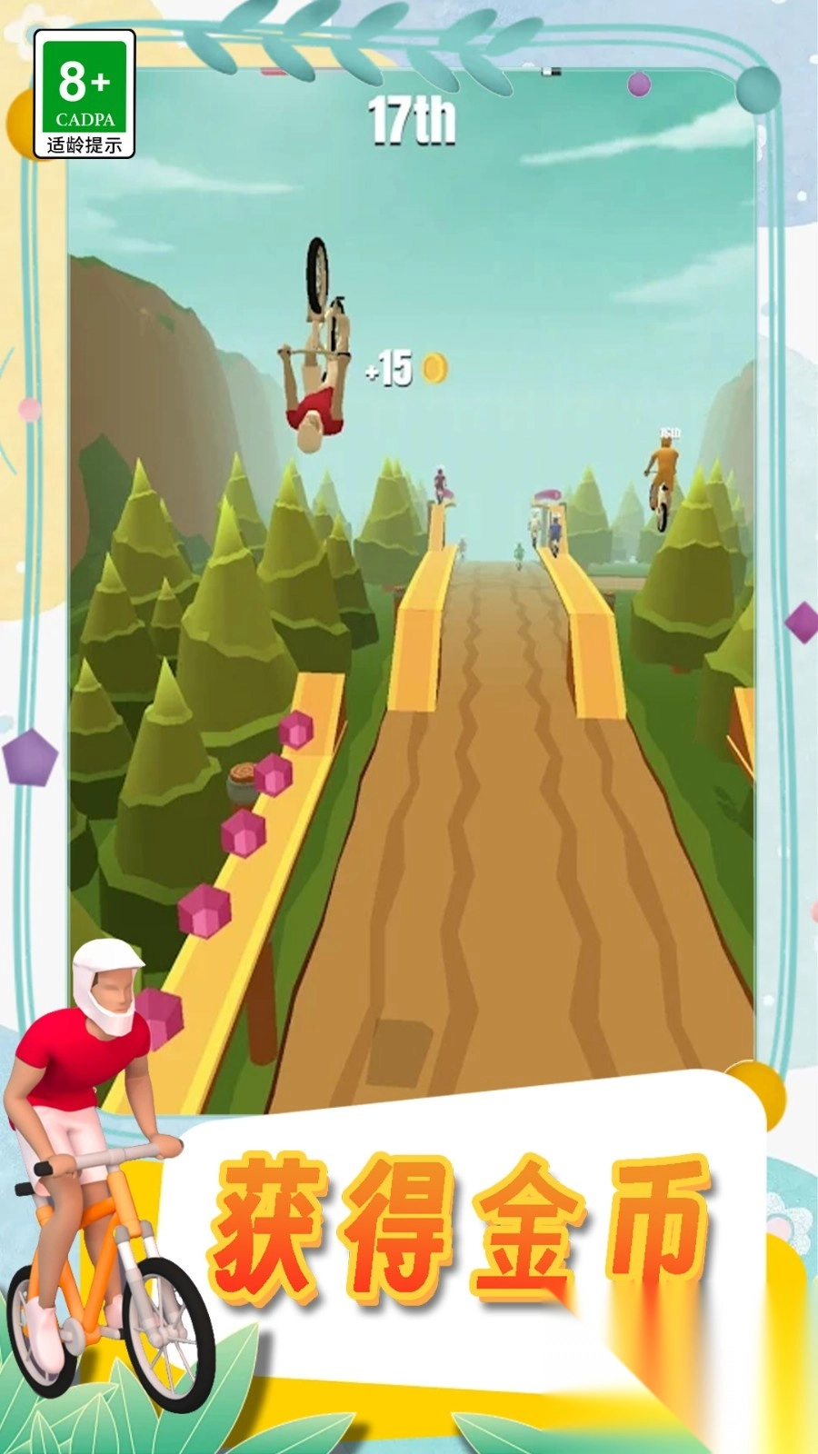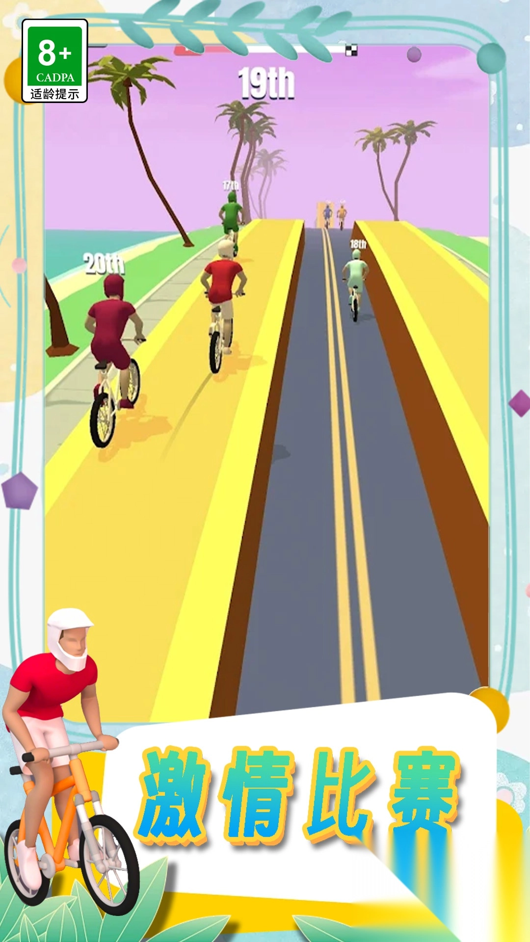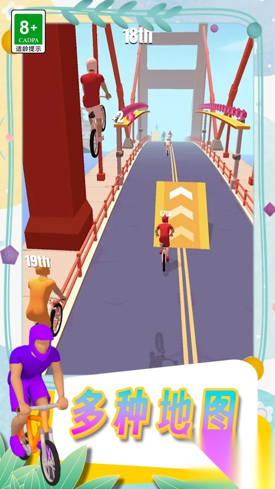 1、通过左右滑动屏幕,控制角色在赛道上灵活移动,巧妙躲避各种障碍物,保证骑行安全。