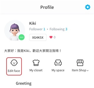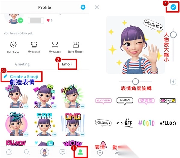 ▼【➀个人资料】→【➁表情】→【➂创造表情】→【➃确认】