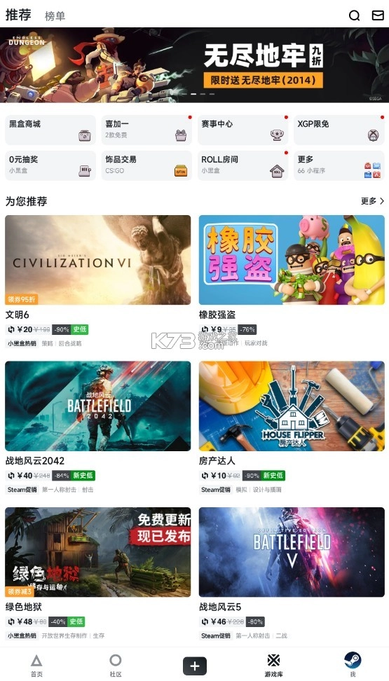 STEAM、EPIC喜加一和史低不再错过: 游戏库包含了各大游戏平台的游戏信息,使你能够轻松查询价格波动、配置需求、游戏评价以及史低特惠等关键信息。小黑盒的"喜加一"功能更是令你不再错过限时免费3A大作,避免遗憾。