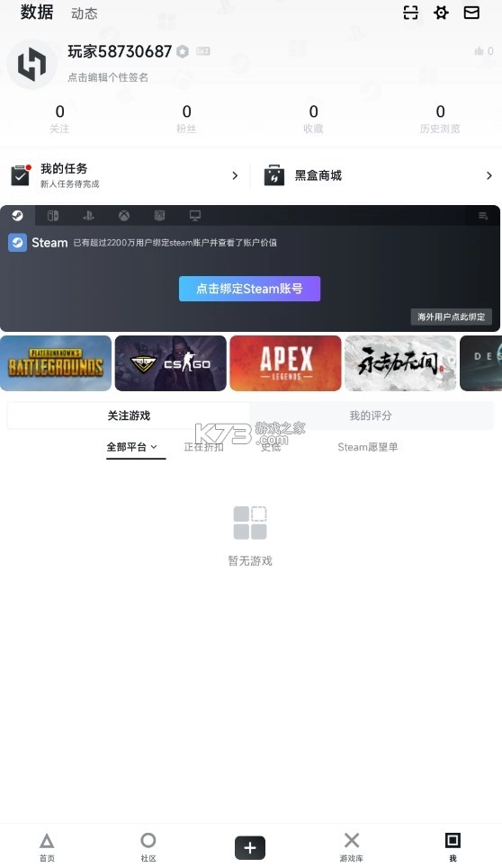 多平台数据绑定与战绩查询: 你可以轻松同步各大游戏平台的数据,包括Steam、EPIC、Switch、PSN、Xbox等。此外,小黑盒还提供了热门游戏的战绩查询,如无畏契约、APEX、绝地求生、原神、永劫无间、命运2、彩虹六号、使命召唤等,让你一站式查看自己和其他玩家的表现。