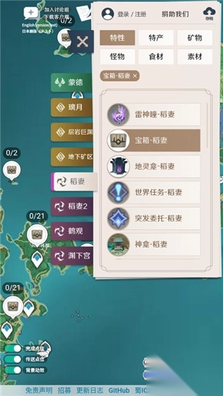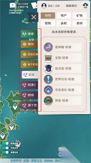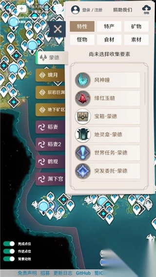 1. 进入工具后,默认加载工具内的特性分类,其中包含风神瞳、绯红玉髓、宝箱、地灵龛等。你不仅能在页面下拉,点击选择所需的类型资源,而且还有特产、矿物、怪物、食材、素材等多种分类可供查找。