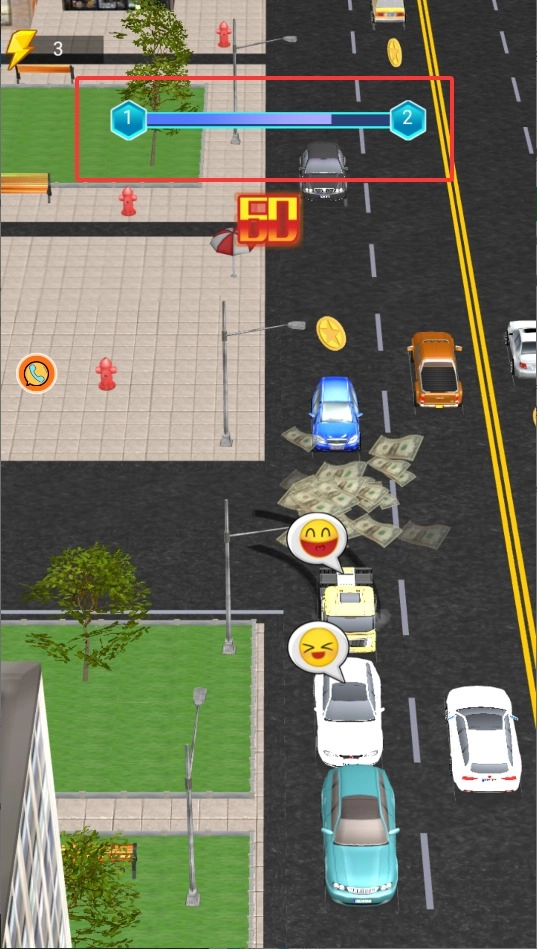 3、每成功调度一辆汽车会累积进度条能量,填满整个能量槽即可通关,后续关卡将出现更复杂的交通路况考验。