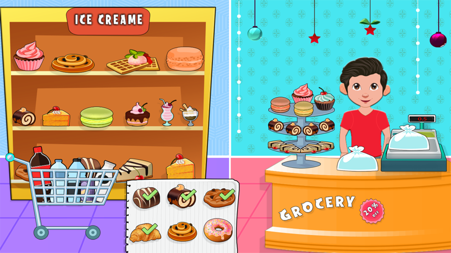 3、让我们开始以超级市场经理,客户或创意探险家的身份玩,享受不同的互动场景和有趣的事物。