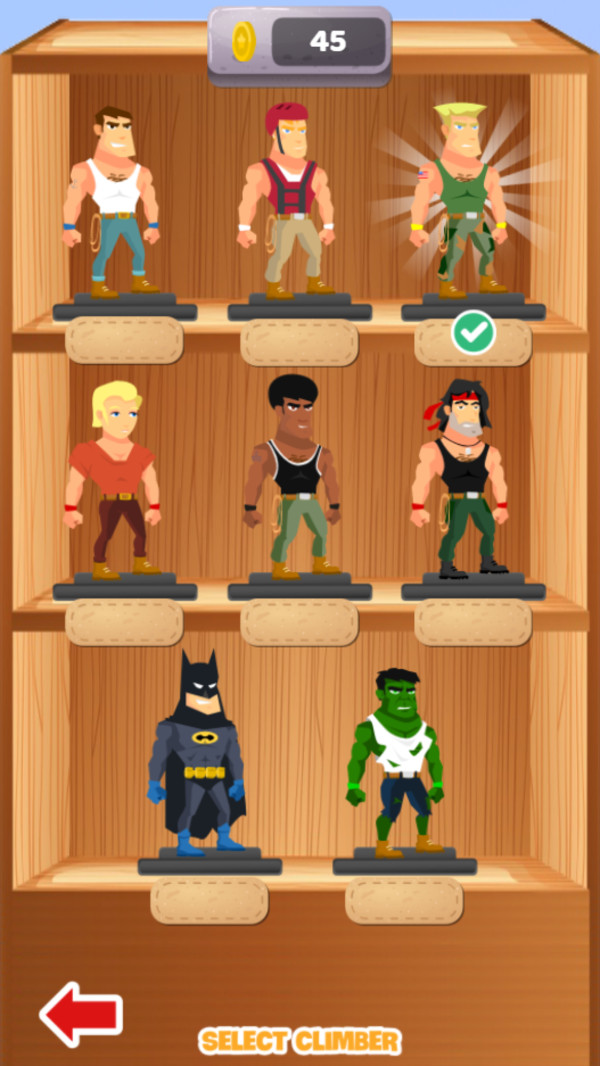 爬山肌肉英雄为玩家们带来了一场极为精彩刺激的爬山冒险,在游戏内拥有着很多的超级英雄角色,而你可以自由选择它们来完成各种各样的攀爬冒险,在游戏内还可以灵活地使用这些超级英雄的技能来帮助自己,向着更高的山峰不断地前进,并不停的去挑战自己的极限能力,快来下载游戏体验一下吧。