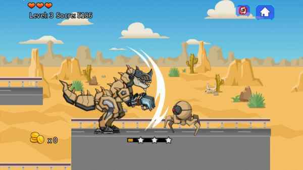 沙漠霸王龙大战是一款玩法比较热血刺激的恐龙闯关游戏,画面感非常的真实,在这里玩家每次挑战有三个生命值。在你的生命值耗尽之前,消灭怪物,就可以顺利通过这里,这里的霸王龙是机械化形象,力量感更强。给玩家极为震撼的视觉效果,喜欢的玩家来下载体验吧!