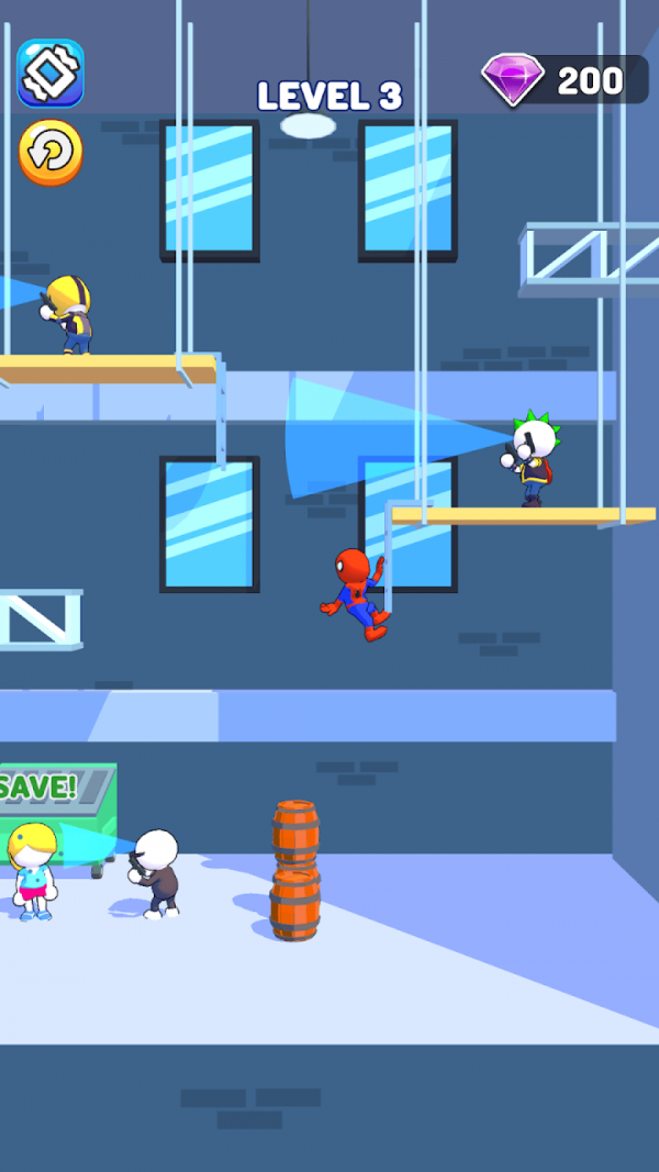 疯狂蜘蛛网:游戏的风格非常的卡通可爱又好玩的动作冒险游戏,这个游戏很好玩,里面人质被坏人抓走,他们分层次看人质,你独自去营救人质,对抗许多敌人,可以小心吐槽蜘蛛网,翻墙,避免惊动所有敌人,游戏玩起来很是精彩有趣,喜欢就来本站下载哦!
