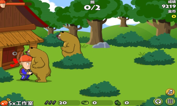 拿盾牌(铁丝网)的熊,正面打除了手雷、地雷之类,是无效的,移动到它后面射击即可,从后面打很容易就打死了。在第十四关之前,不用在拿盾牌的熊上浪费手雷、地雷,都在后面打。最后两关,由于熊移动速度很快,在后面会加快熊移动的速度,很容易让熊攻入小木屋导致关卡失败。这时准备大量手雷对付他们。