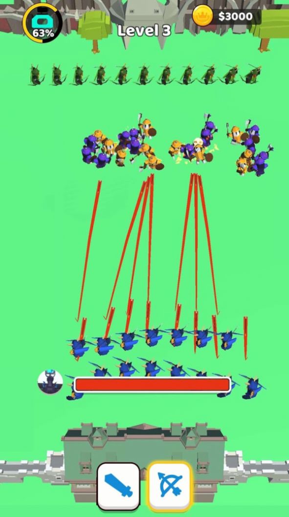 4、使用突击兵种攻击敌人的射手,用坦克兵种抵挡射手的弓箭,并保护我方弓箭手攻击。