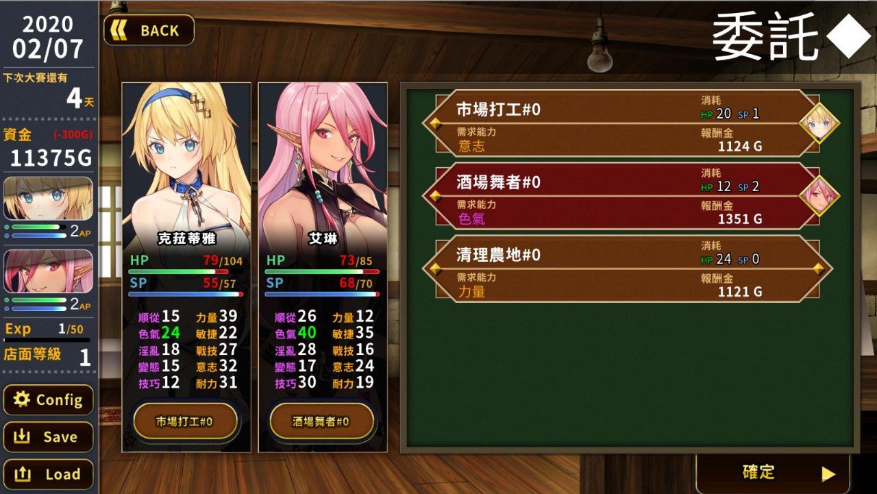 2、资金:资金主要靠做回合末的委托任务,其中卖是最快的,因此优先将调 教能力提升到任务需求以上是当务之急,满足要求后就全部用来训练。能力值提高到一定水平可以得到称号,而某些任务中,特定称号可以提高报酬,但是比较后期,前期不考虑。