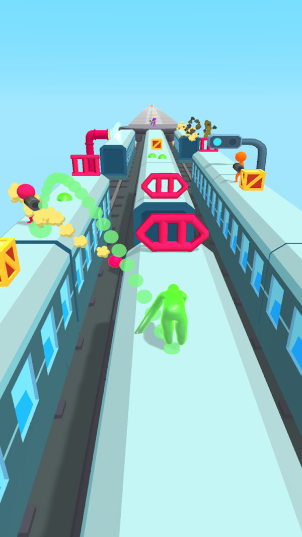 控制着自己的橡胶人在各种各样的跑道之中不断地前进,为了能够使自己快速的抵达终点,你可以选择使用各种不同功能的道具。