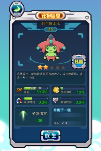 另一种搭配为范围攻击类型加上穿透攻击类型的萌宠,范围攻击类型的特点是子弹碰触敌人后能造成大范围的伤害,攻击速度缓慢,但伤害极高。穿透攻击的特点是对一列的敌机造成均等伤害,除了障碍物与异形,其余均可穿透。如果玩家运气好,都能获取到三星宠物自然最好。但即使得到一二星宠物也无妨,一样可以通过培养来提升宠物战力。