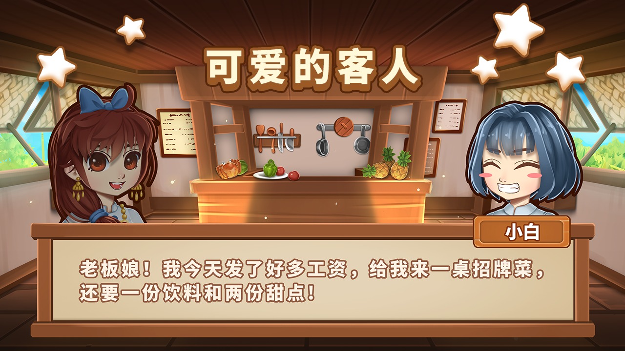 3、玩家需要根据客人的需要,迅速将客人想要的美食做好,不能让顾客等太久。