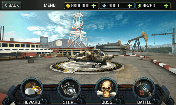1、用各种武器和装备武装你的直升机,在蓝天之中进行自由的翱翔。