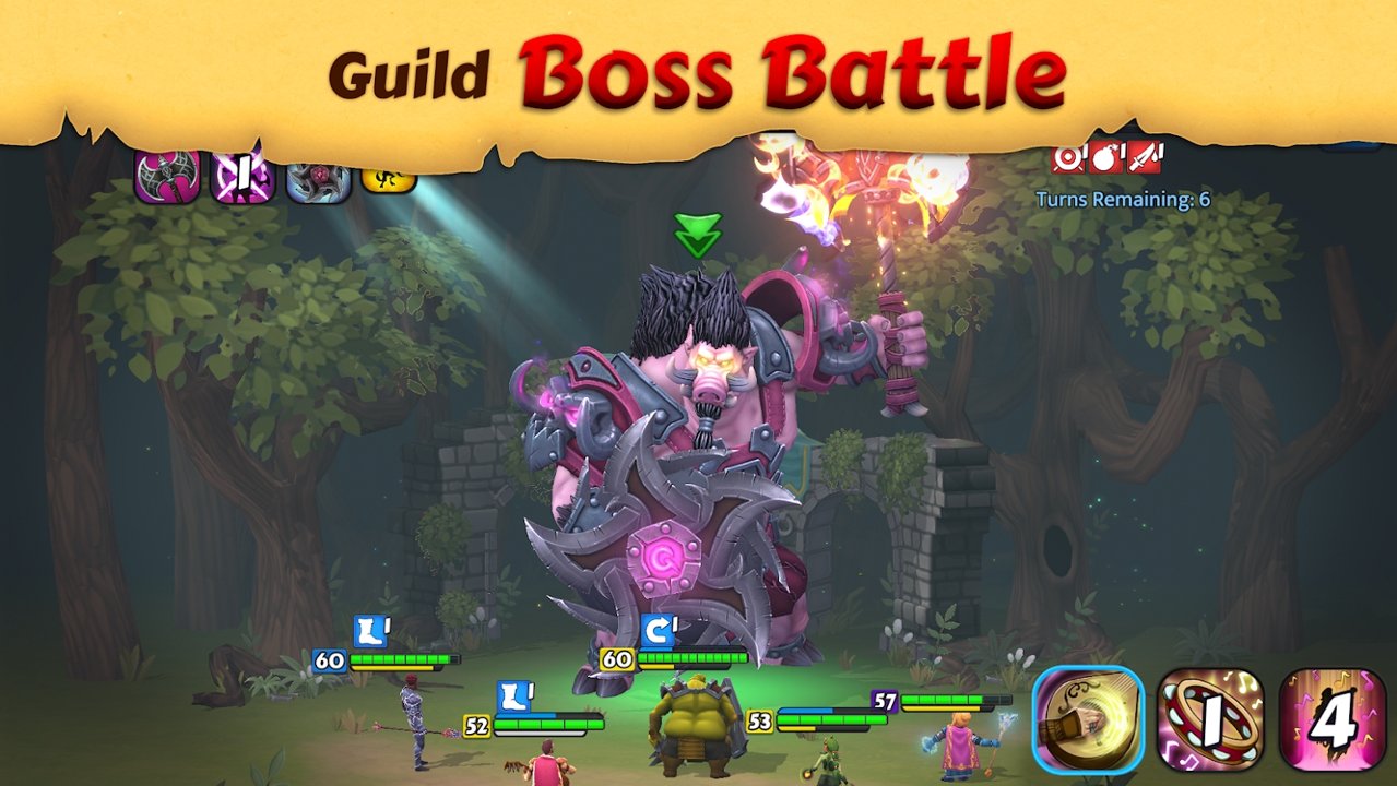 3、通过游戏板级别战斗或与朋友一起参加公会boss战。收集并升级所有类型的奇幻英雄:圣骑士、巫师、盗贼等等。