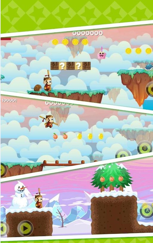 1、双击或按住跳跃的按钮进行翻滚跳跃,左侧屏幕点击移动,A使用棍子攻击,B发射桃核。