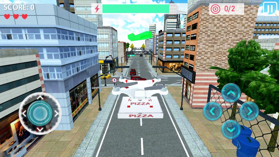 穿梭于城市之间的无人机竟然是配送比萨饼的设备,玩家小心的控制无人机躲避障碍物,在电量耗尽之前完成飞行配送任务即可。