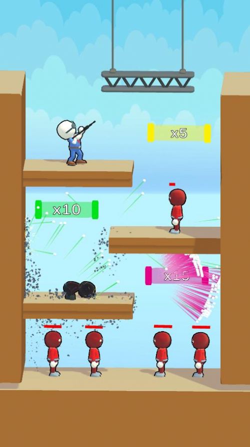 游戏中,你可以尽情的畅玩,依靠各种地形障碍帮助自己,成功击中躲藏的敌人,只有全部击杀所有敌人,才能顺利过关,获得奖励~