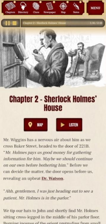 探访地点,采访福尔摩斯时代的人物,解谜破案,解锁新线索和章节!