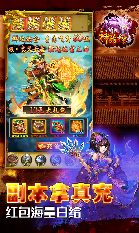 【神骑世界躺平】送真充版是一款极致策略以三国背景故事为题材的竞技手游,炫酷无比的战斗特效让每一个玩家都可以在游戏中迅速的获取极致的欢乐,热血精彩的对战模式,激烈四射的闯关内容,过五关斩六将海量丰富角色任你自由肆意选择,精彩的技能随心所欲的搭配组合,畅爽的在游戏中展开激烈震撼的打斗,一起来构建激烈刺激热血的战争世界吧!