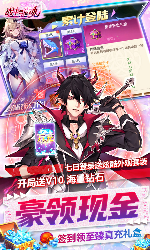 1、创角即送VIP10、38888钻石、58888绑钻、500W金币、稀有材料礼包、绝版称号、挑战龙魂秘境,得万元真充卡。