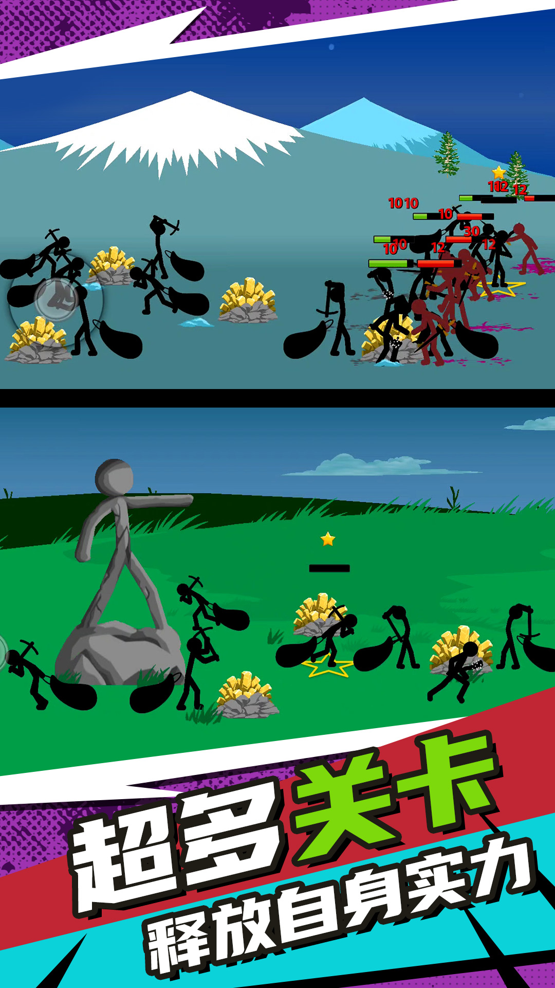收集各种不同性能的火柴人,组建战斗单位,开采黄金或是发起战争争夺领土。