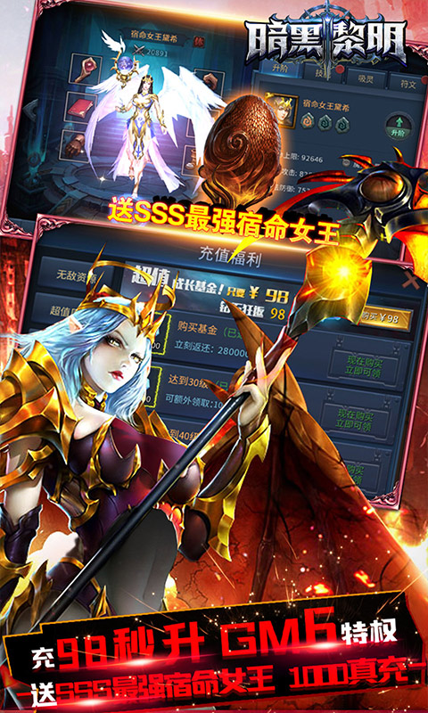 1、尊享98送3000GM点卡,秒升GM6,至尊女王MAX套开局控场!爆炸福利无敌资源,每日千倍返利根本花不完!