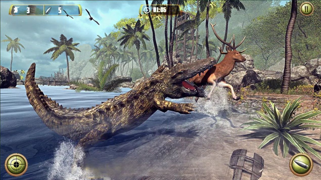 【致命鳄鱼】是一款模拟性十分明显的狩猎游戏,不过玩家所扮演的并不是人类,而是一条鳄鱼,鳄鱼的体型会随着玩家在游戏中的狩猎不断增长,所以玩家的狩猎方式和对象是十分重要的。游戏中的野外场景各种细节都是十分真实的,有着一种十分明显的拟真感。