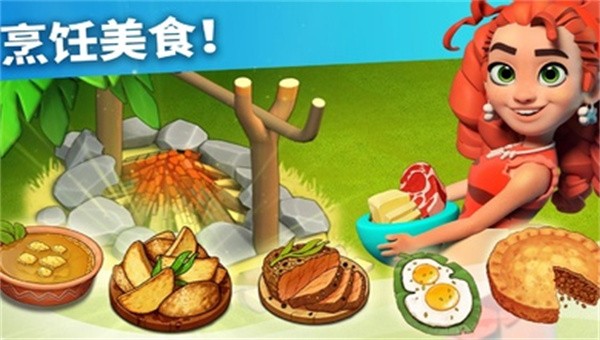 为野人一家制作美食,寻找食物、木材,生火开始制作美食。